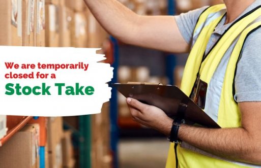 Our website will remain fully functional for you to browse through our product range and online orders will be accepted if you choose to make a payment. However, no orders will be processed or dispatched from our warehouse during our stock take closure. Please be aware that we cannot confirm any specific dispatch dates but will ensure orders are sent at our earliest opportunity on our return.